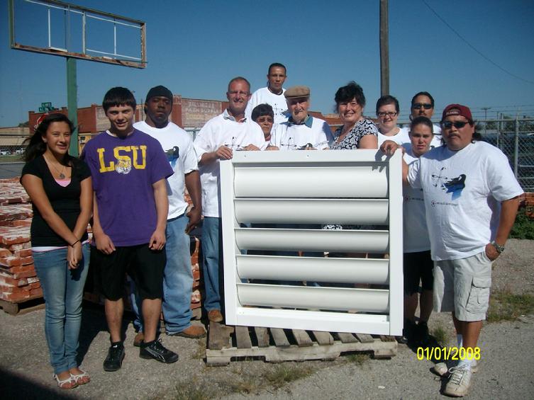 The solar shutter device listed in the picture was the 18th put together by Wind Hollow Native Energy as part of its technical steps in designing theassembly plant setup and writing the employee training materials. Theseunits were completed in training sessions by former ALS workers shown above. The Technical name for the solar shutter device is "HOSS", Horizontal Opening Solar Solutions.